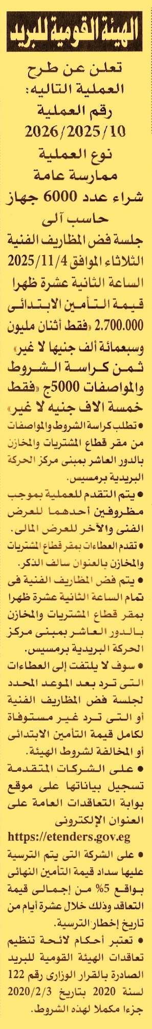 HOT information ممارسة عامة رقم 10/2025/2026 لعملية توريد عدد 6 ألاف جهاز حاسب ألي عن جريدة الأهرام Post navigation هيئة إنقاذ الطفولة – مكتب مصر الإدارة العامة لصرف شمال غرب البحيرة