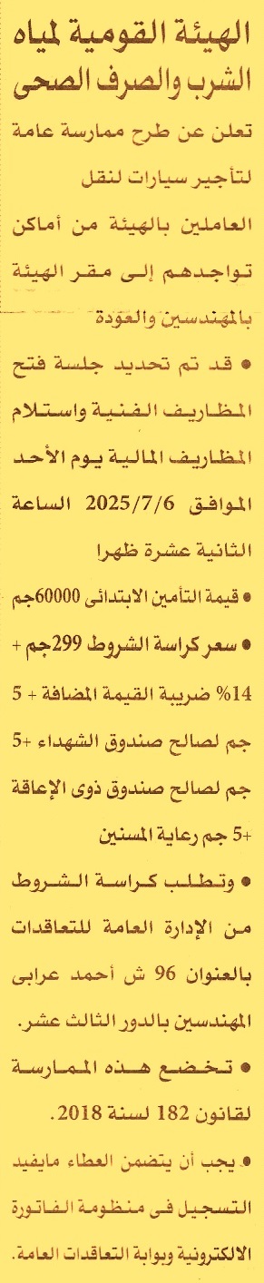 تأجير سيارات لنقل العاملين بالهيئة من اماكن تواجدهم الي مقر الهيئة بالمهندسين والعودة
