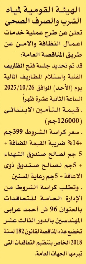 HOT information مناقصة عامة لعملية تنفيذ أعمال النظافة والأمن عن جريدة الأهرام Post navigation جامعة بنها المصفي القضائي/ هشام كمال عليم