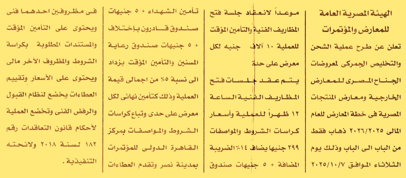 HOT Information ممارسة عامة لعملية تنفيذ أعمال الشحن والتخليص الجمركي لمعروضات الجناح المصري للمعارض الخارجية ومعارض المنتجات المصرية في خطة المعارض للعام المالي 2025/2026 ذهاب فقط من الباب إلى الباب عن جريدة الأخبار Post navigation الهيئة العامة للتنمية الصناعية مركز شباب المعادي