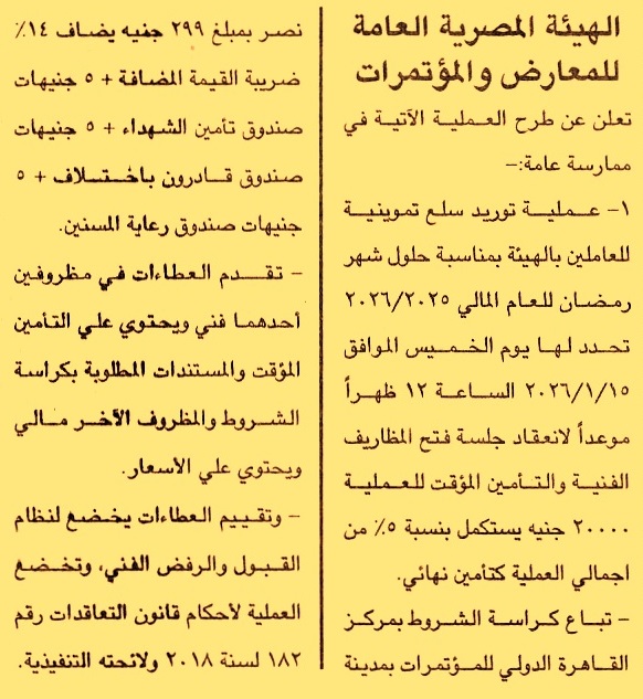 HOT information ممارسة عامة لعملية توريد سلع تموينية للعاملين بالهيئة بمناسبة حلول شهر رمضان للعام المالي 2025/2026 عن جريدة الجمهورية Post navigation معهد بحوث الصحة الحيوانية النادي الأهلي للرياضة البدنية