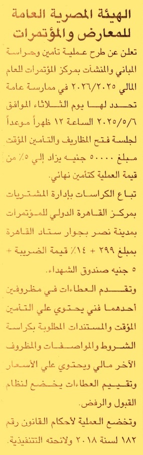HOT Information ممارسة عامة لعملية تأمين وحراسة المباني والمنشأت بمركز المؤتمرات للعام المالي 2025/2026 عن جريدة الجمهورية Post navigation جامعة دمنهور MINISTERY OF HOUSING UTILTIES AND URBAN COMMUNITIES