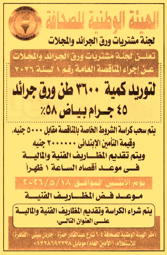 توريد كمية 3600 طن ورق جرائد 45 جرام بياض 58%