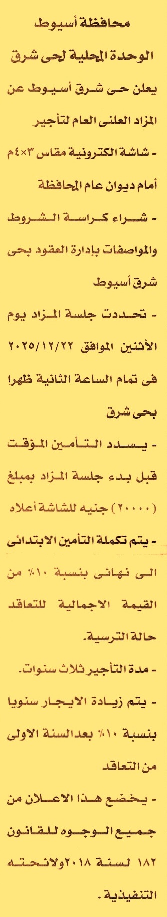 HOT Information مزايدة علنية عامة لعملية تأجير شاشة الكترونية مقاس 3×4م أمام ديوان عام المحافظة لمدة 3 سنوات بزيادة 10% سنويا عن جريدة الأخبار Post navigation مركز شباب أبو الغيط شركة مصر للبترول
