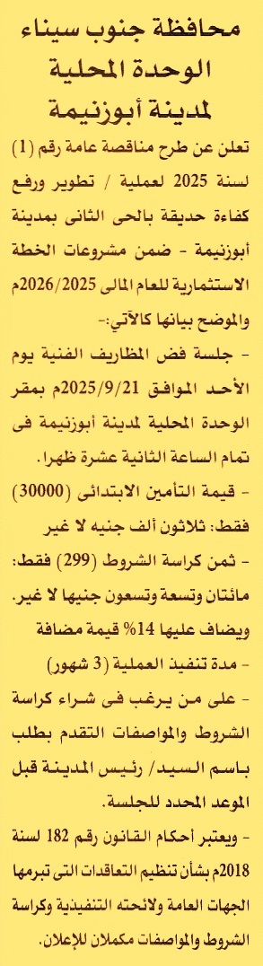 HOT information مناقصة عامة رقم 1/2025 لعملية تطوير ورفع كفاءة حديقة بالحي الثاني بالمدينة مدة التنفيذ 3 أشهر عن جريدة الأهرام Post navigation جامعة المنصورة جامعة اسيوط