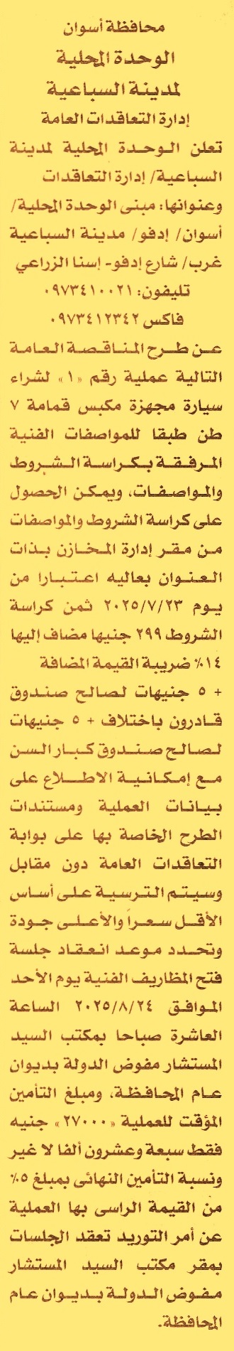 HOT Information مناقصة عامة رقم 1 لعملية توريد سيارة مجهزة مكبس قمامة 7 طن (تباع الكراسة من يوم 23/7/2025) عن جريدة الأخبار Post navigation محافظة سوهاج الوحدة المحلية لمركز ومدينة ساقلتة