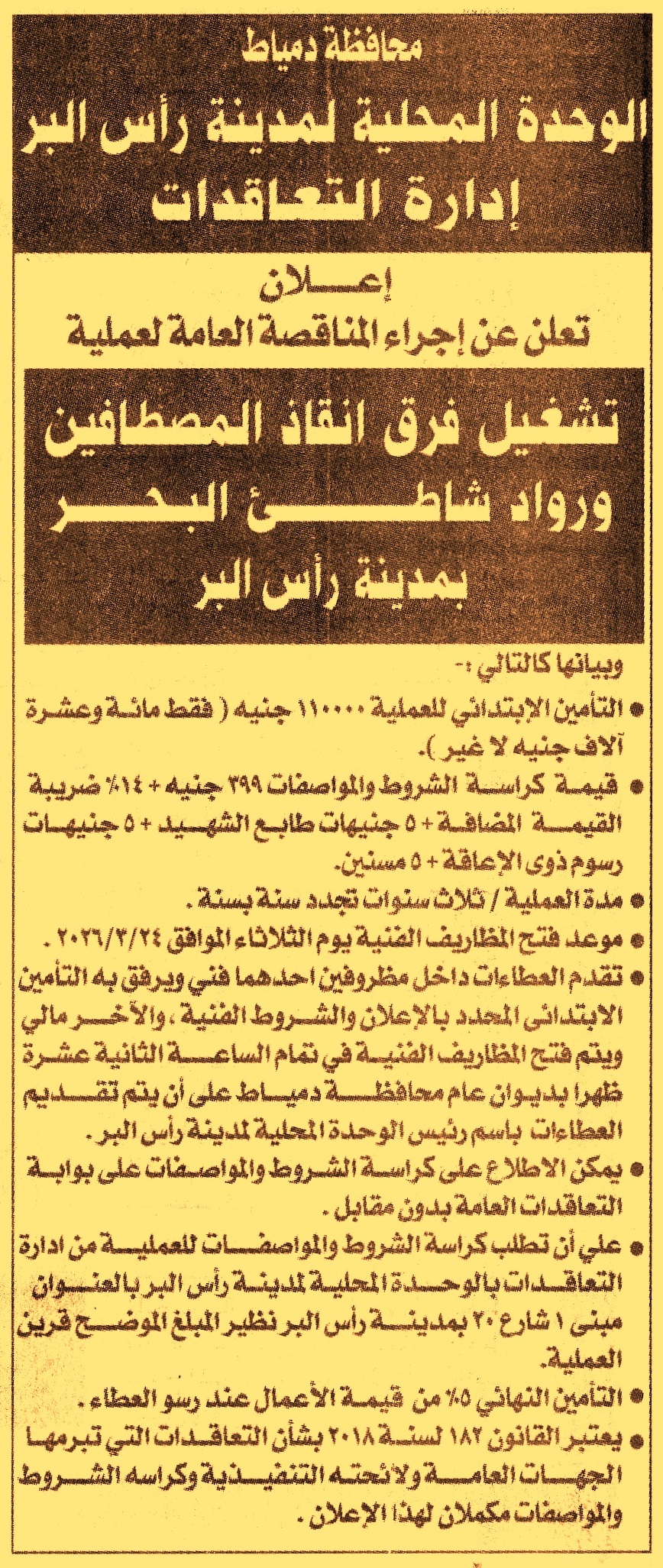 HOT Information مناقصة عامة لعملية تشغيل فرق انقاذ المصطافين ورواد شاطئ البحر بمدينة رأس البر مدة العملية 3 سنوات تجدد سنة بسنة (العملية قابلة للتجزئة) عن جريدة الجمهورية Post navigation مركز التنمية الشبابية بالسادات المنوفية مركز شباب أبو عدوي بدمياط