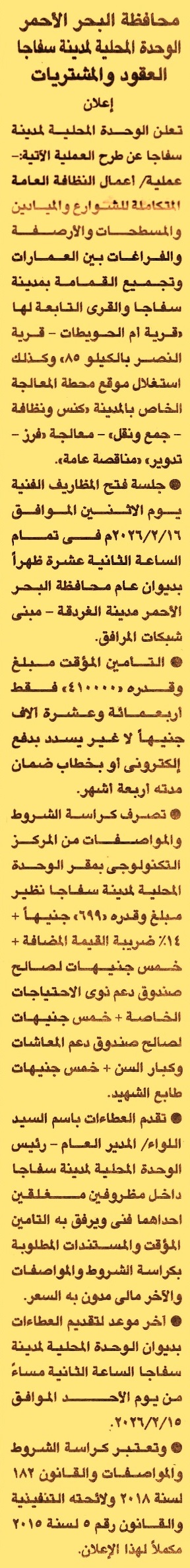 تنفيذ أعمال النظافة العامة المتكاملة للشوارع والميادين والمسطحات والأرصفة والفراغات بين العمارات وتجميع القمامة بمدينة سفاجا والقرى التابعة لها “قرية أم الحويطات, قرية النصر بالكيلو 85”
