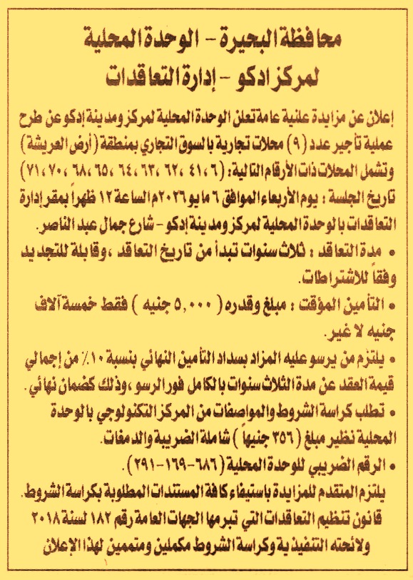 HOT Information مزايدة علنية عامة لعملية تأجير عدد 9 محلات تجارية بالسوق التجاري بمنطقة أرض العريشة وتشمل المحلات ذات الأرقام التالية “6, 41, 62, 63, 64, 65, 68, 70, 71” لمدة 3 سنوات قابلة للتجديد عن جريدة الجمهورية Post navigation المعهد القومي للحوكمة والتنمية المستدامة الوحدة المحلية لمركز ومدينة زفتي