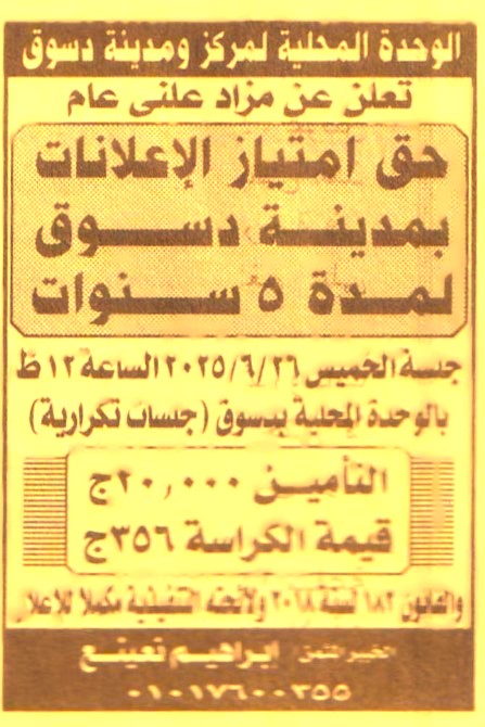 HOT information مناقصة عامة لعملية حق امتياز الاعلانات بمدينة دسوق لمدة 5 سنوات عن جريدة الاخبار Post navigation نادي عرب راشد الرياضي شركة السكر والصناعات التكاملية المصرية