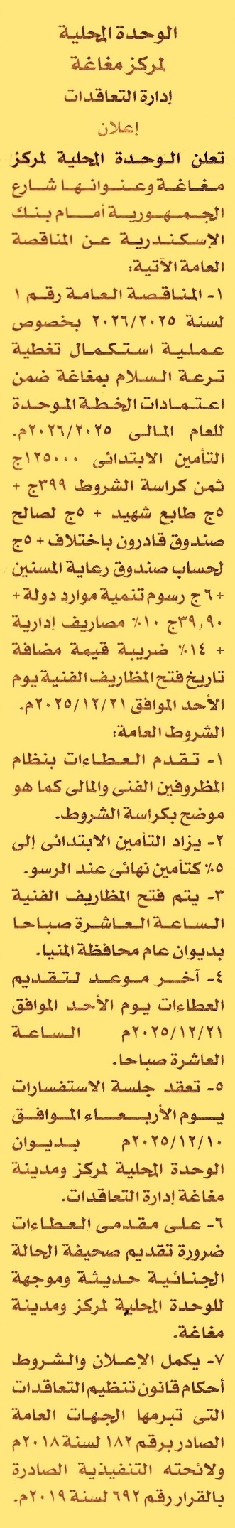 HOT Information مناقصة عامة رقم 1/2025/2026 لعملية استكمال تغطية ترعة السلام بمغاغة (جلسة الاستفسارات يوم 10/12/2025 ويرفق مع المستندات صحيفة الحالة الجنائية حديثة) عن جريدة الأخبار Post navigation الهيئة العامة للرعاية الصحية بمحافظة السويس مديرية الصحة بالقليوبية