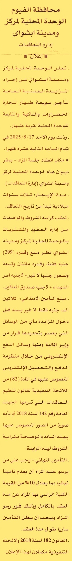 HOT Information مزايدة علنية عامة لعملية تأجير سويقة طبهار لتجارة الخضروات والفاكهة التابعة للوحدة المحلية لقرية طبهار لمدة 3 سنوات عن جريدة الأهرام Post navigation مستشفى قصر العيني التعليمي الجديد شركة مضارب الشرقية