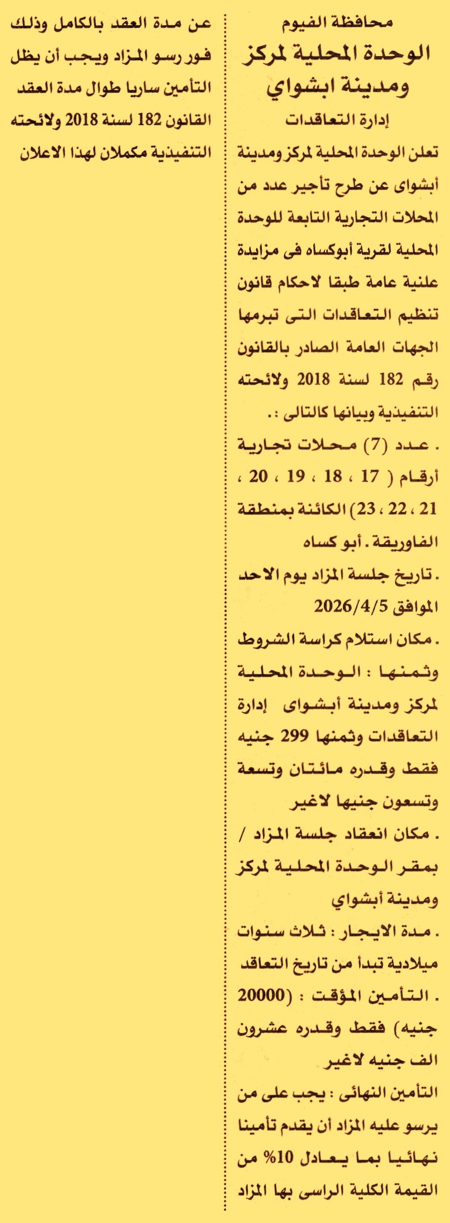 HOT Information مزايدة علنية عامة لعملية تأجير عدد 7 محلات تجارية الكائنة بمنطقة الفاوريقة – أبو كساه لمدة 3 سنوات عن جريدة الأهرام Post navigation EGYPTIAN ELECTRICITY TRANSMISSION COMPANY محكمة الوادي الجديد الابتدائية