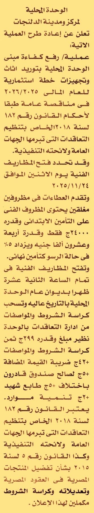 HOT Information إعادة مناقصة عامة لعملية رفع كفاءة مبنى الوحدة المحلية بتوريد أثاث وتجهيزات عن جريدة الأخبار Post navigation الإدارة العامة للموارد المائية والري بالقليوبية شركة الإسكندرية للزيوت والصابون