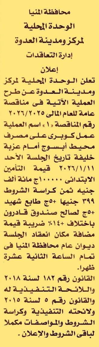 HOT Information مناقصة عامة رقم 1/2025/2026 لعملية إنشاء كوبري على مصرف محيط أبسوج أمام عزبة خليفة عن جريدة الأخبار Post navigation الهيئة القومية للأنفاق رئاسة حي غرب المنصورة