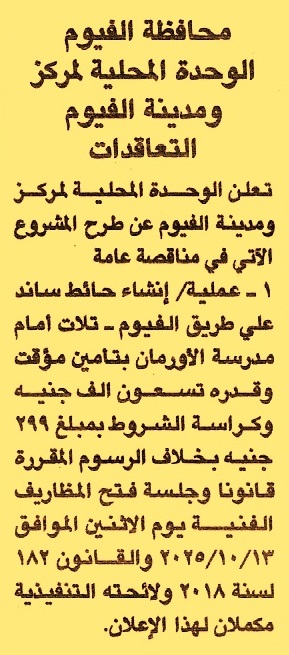 HOT Information مناقصة عامة لعملية إنشاء حائط ساند على طريق الفيوم – تلات أمام مدرسة الأورمان (فئة التصنيف الخامسة شعبة أشغال عامة) عن جريدة الجمهورية Post navigation مستشفى طب الأزهر الجامعي مركز شباب المنيرة