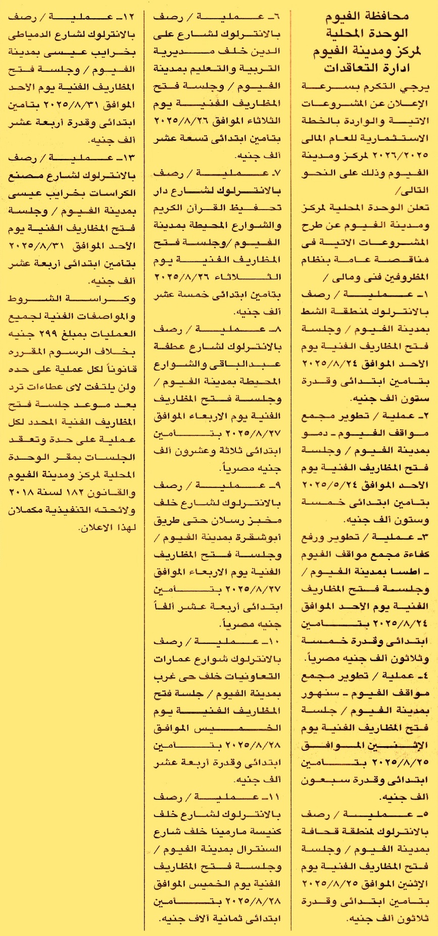 HOT Information مناقصة عامة لعملية رصف بالإنترلوك لمنطقة الشط بمدينة الفيوم عن جريدة الجمهورية Post navigation جمعية الكشافة البحرية بالجيزة حي شرق مدينة نصر