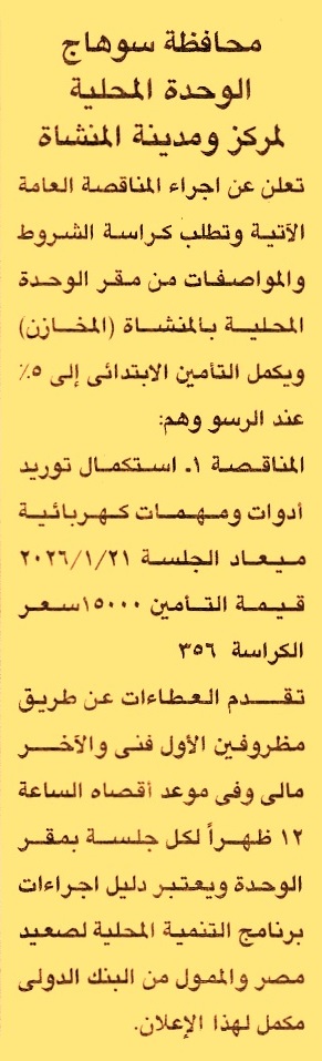 HOT Information مناقصة عامة لعملية استكمال توريد أدوات ومهمات كهربائية عن جريدة الجمهورية Post navigation محافظة القاهرة مركز شباب ابنهس