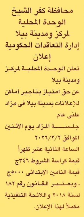 HOT Information مزايدة علنية عامة لعملية تأجير أماكن للإعلانات بمدينة بيلا عن جريدة الجمهورية Post navigation نقابة المعلمين بكفر الشيخ الإتحاد التعاوني الإسكاني المركزي