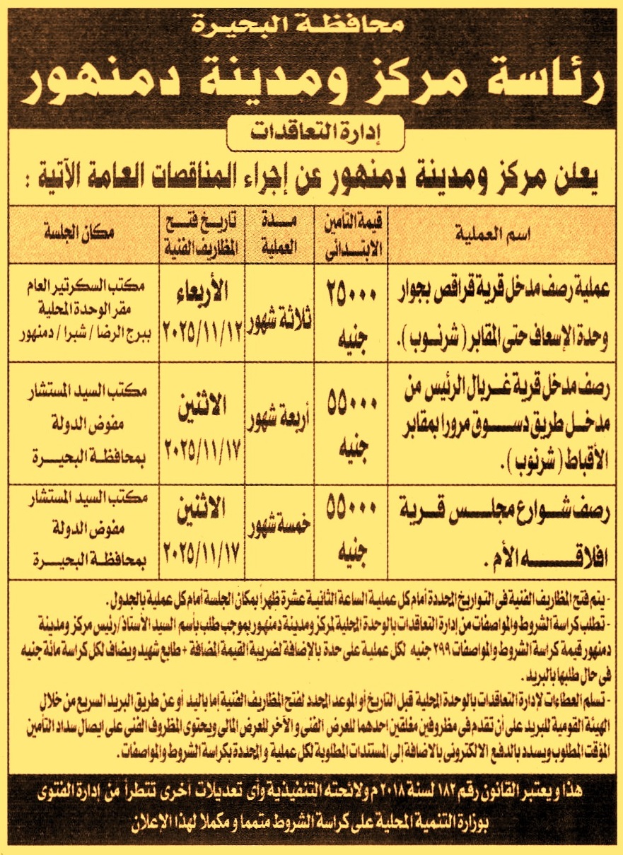 HOT Information مناقصة عامة لعملية رصف مدخل قرية قراقص بجوار وحدة الإسعاف حتى المقابر “شرنوب” مدة العملية 3 أشهر عن جريدة الجمهورية Post navigation مستشفى المطرية التعليمي حي الهرم