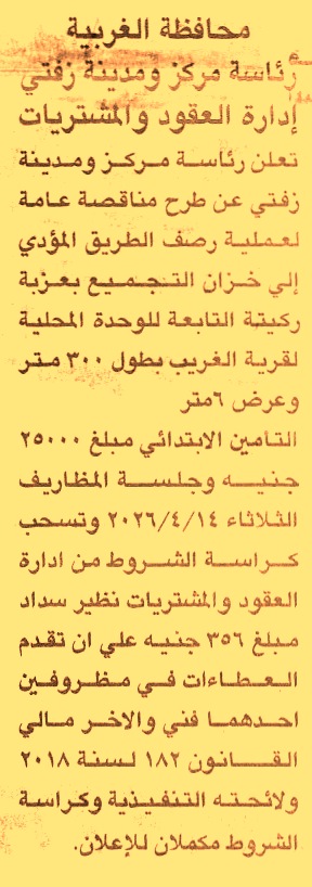 رصف الطريق المؤدي إلى خزان التجميع بعزبة ركيتة التابعة للوحدة المحلية لقرية الغريب بطول 300م وعرض 6م