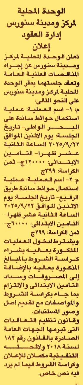 HOT Information مناقصة عامة لعملية استكمال حوائط ساندة على البحر الواطي (تقدم مع المستندات الأصول للإطلاع) عن جريدة الجمهورية Post navigation مركز التنمية الشبابية بالفرافرة شركة مياه الشرب والصرف الصحي بدمياط