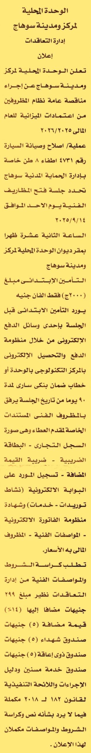 HOT Information مناقصة عامة لعملية اصلاح وصيانة السيارة رقم 4731 إطفاء 8 طن خاصة بإدارة الحماية المدينة بسوهاج (مدة سريان خطاب الضمان 3 أشهر) عن جريدة الأهرام Post navigation الوحدة المحلية لمركز ومدينة الواسطى محافظة الفيوم