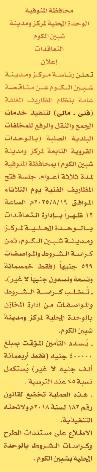 HOT Information مناقصة عامة لعملية تنفيذ خدمات الجمع والنقل والرفع للمخلفات البلدية الصلبة بالوحدات القروية التابعة لمركز ومدينة شبين الكوم بمحافظة الفيوم لمدة 3 سنوات (يرفق مع المستندات سابقة أعمال) عن جريدة الأخبار Post navigation جامعة مدينة السادات جامعة بنها