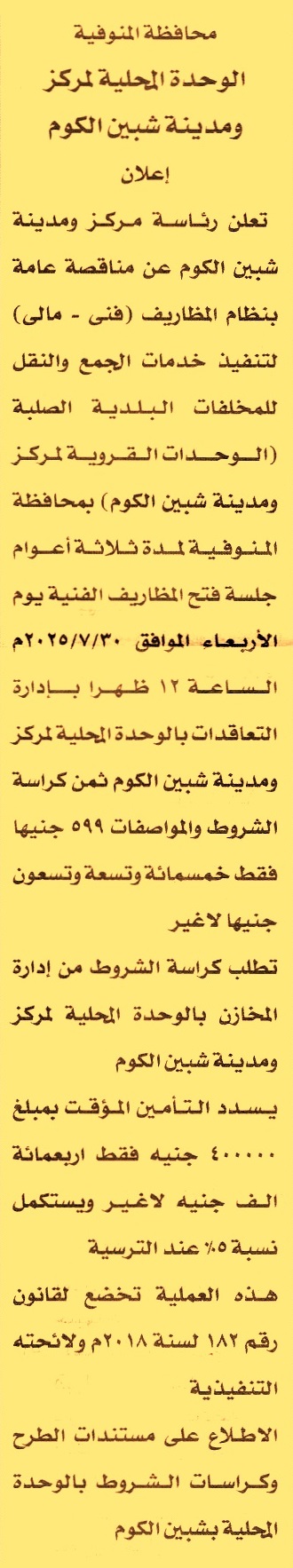 HOT information مناقصة عامة لعملية تنفيذ خدمات الجمع والنقل للمخلفات البلدية الصلبة “الوحدات القروية لمركز ومدينة شبين الكوم” بمحافظة المنوفية لمدة 3 سنوات عن جريدة الأخبار Post navigation مجلس الدولة الجمعية المشتركة للإصلاح الزراعي منطقة كفر الشيخ