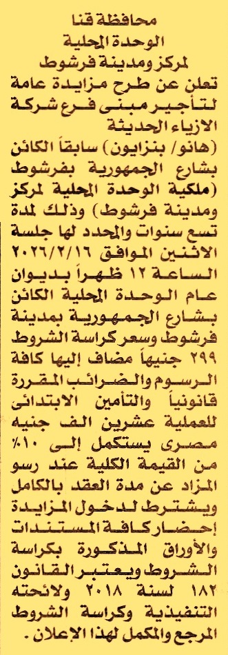 الكائن بشارع الجمهورية بفرشوط لمدة 9 سنوات