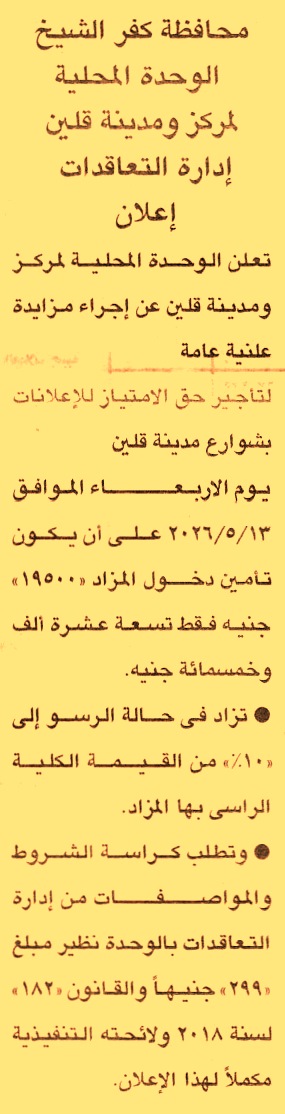 HOT information مزايدة علنية عامة لعملية تأجير حق الامتياز للإعلانات بشوارع مدينة قلين عن جريدة الجمهورية Post navigation شركة البحيرة لتوزيع الكهرباء هيئة الإسعاف المصرية
