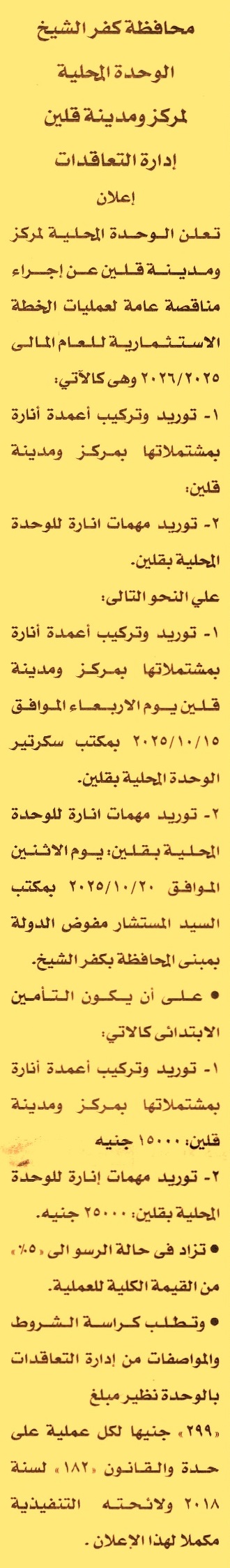 HOT Information مناقصة عامة لعملية توريد وتركيب أعمدة إنارة بمشتملاتها بمركز ومدينة قلين عن جريدة الأخبار Post navigation الهيئة العامة لموانئ البحر الأحمر شركة السلام للمشروعات العقارية والتنمية السياحية