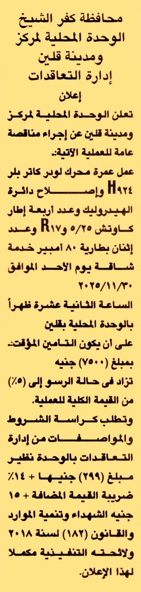 HOT Information مناقصة عامة لعملية عمل عمرة محرك لودر كاتربلر H924 وإصلاح دائرة الهيدروليك وعدد 4 إطار كاوتش 25/5 وR17 وعدد 2 بطارية 80 أمبير خدمة شاقة عن جريدة الجمهورية Post navigation الإدارة العامة المتكاملة لري شرق الفيوم شركة البتروكيماويات المصرية