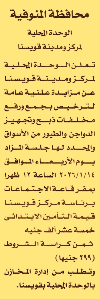 HOT Information مزايدة عامة لعملية الترخيص بجمع ورفع مخلفات ذبح وتجهيز الدواجن والطيور من الأسواق عن جريدة الأخبار Post navigation مؤسسة أخبار اليوم محافظة القليوبية
