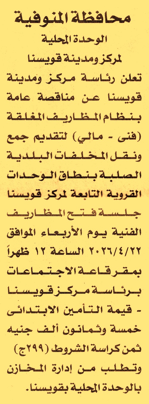HOT Information مناقصة عامة لعملية جمع ونقل المخلفات البلدية الصلبة بنطاق الوحدات القروية التابعة لمركز قويسنا عن جريدة الأخبار Post navigation شركة مياه الشرب والصرف الصحي بكفر الشيخ الهيئة العامة للتأمين الصحي