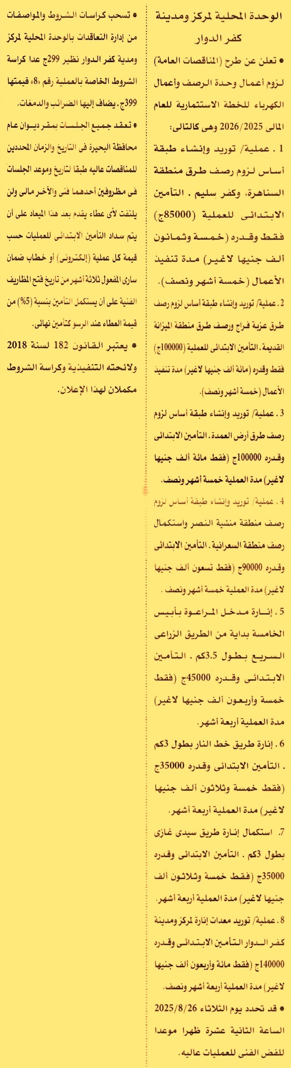 (8) توريد معدات إنارة لمركز ومدينة كفر الدوار “مدة العملية 4 أشهر ونصف”