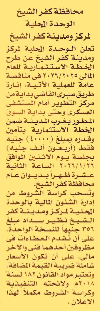 HOT Information مناقصة عامة لعملية إنارة طريق صبري القاضي بداية من مركز التطوير أمام المستشفى العسكري وحتى بداية السوق المطور بغرب المدينة عن جريدة الأخبار Post navigation بنك التنمية الصناعية الشركة المصرية للصيانة وخدمات السكك الحديدية
