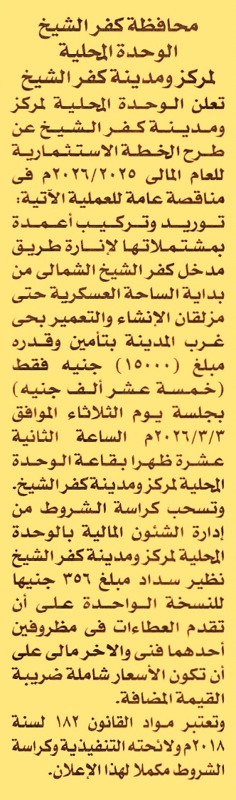 توريد وتركيب أعمدة بمشتملاتها لإنارة طريق مدخل كفر الشيخ الشمالي