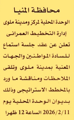 تعلن عن عقد جلسة استماع للسادة المواطنين والجهات المعنية بمدينة ملوي