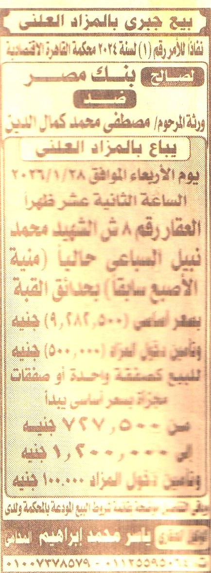 HOT information مزايدة علنية لعملية بيع العقار رقم 8 ش. الشهيد محمد نبيل السباعي حاليا (منية الأصبع سابقا) بحدائق القبة بسعر أساسي (9.282.500ج ) عن جريدة الأخبار Post navigation معهد بحوث الأراضي والمياه الوكيل العقاري مصطفى علي فتوح