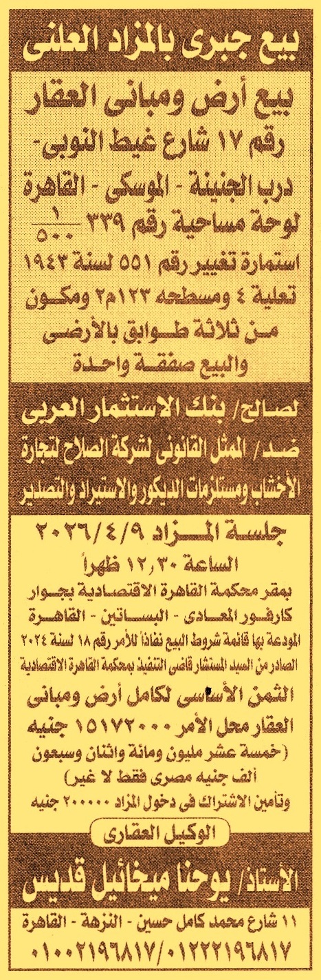 HOT Information مزايدة علنية لعملية بيع أرض ومباني عقار بمساحة 123م2 الكائن رقم 17 بشارع غيط النوبي – درب الجنينة – الموسكي – القاهرة مكون من 3 طوابق بالأرضي “البيع صفقة واحدة” بثمن أساسي 15.172.000ج عن جريدة الأخبار Post navigation محافظة سوهاج المركز الطبي للعاملين بقطاع البترول بالسويس