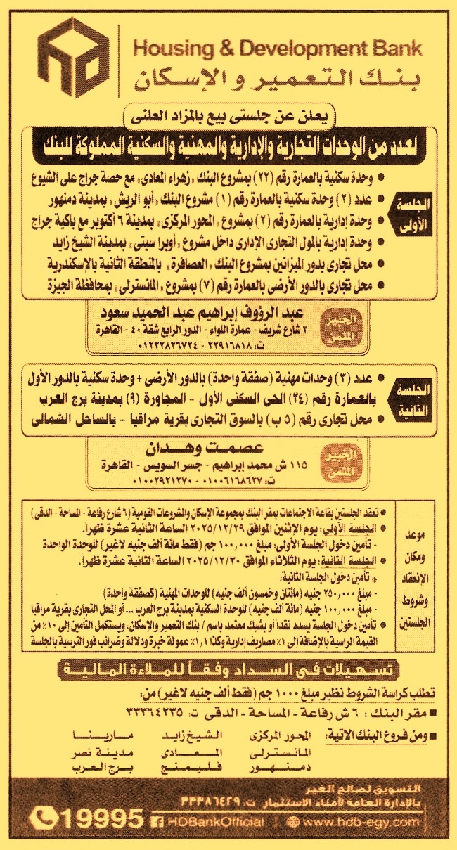 HOT information مزايدة علنية لعملية بيع الأتي (1) محل تجاري بدور الميزانين بمشروع البنك “العصافرة” بالمنطقة الثانية بالإسكندرية (2) محل تجاري بالدور الأرضي بالعمارة رقم 7 بمشروع المانسترلي – محافظة الجيزة (تسهيلات في السداد) عن جريدة الأهرام Post navigation وزارة السياحة والأثار شركة مصر لإدارة الأصول العقارية