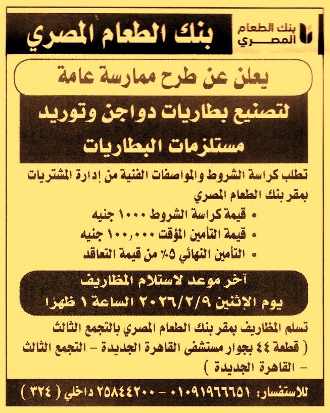 HOT Information ممارسة عامة لعملية تصنيع بطاريات دواجن وتوريد مستلزمات البطاريات عن جريدة الأهرام Post navigation شركة مياه الشرب والصرف الصحي بالشرقية الشركة المصرية للمطارات
