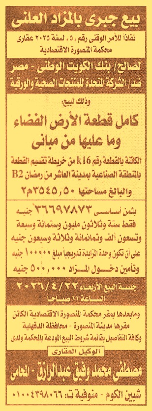 الكائنة بالقطعة رقم K16 من خريطة تقسيم القطعة بالمنطقة الصناعية بمدينة العاشر من رمضان B2