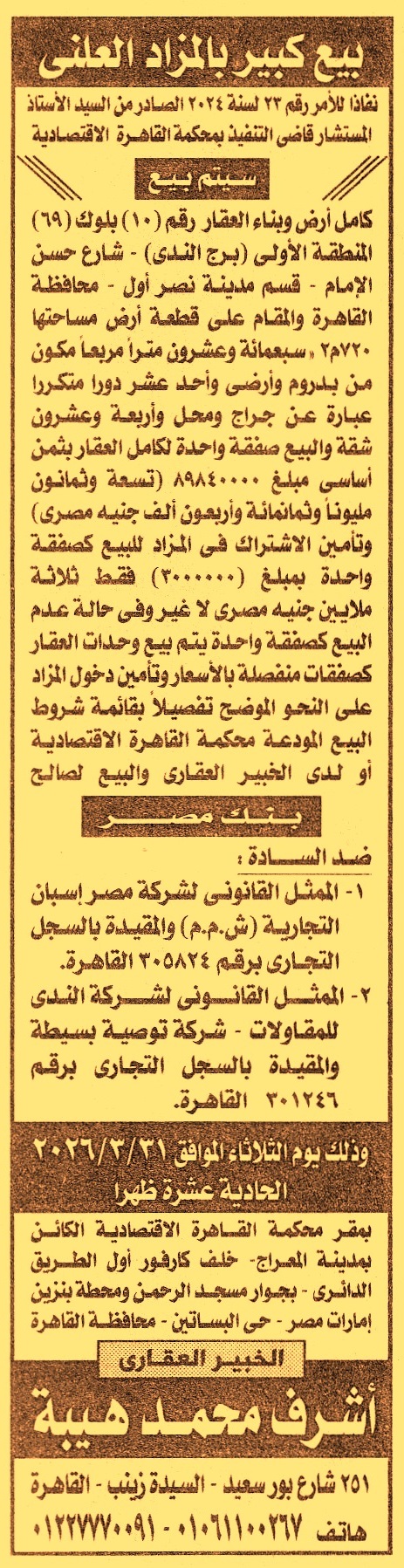 بيع كامل أرض وبناء العقار رقم 10 بلوك 69 المنطقة الأولى “برج الندى”