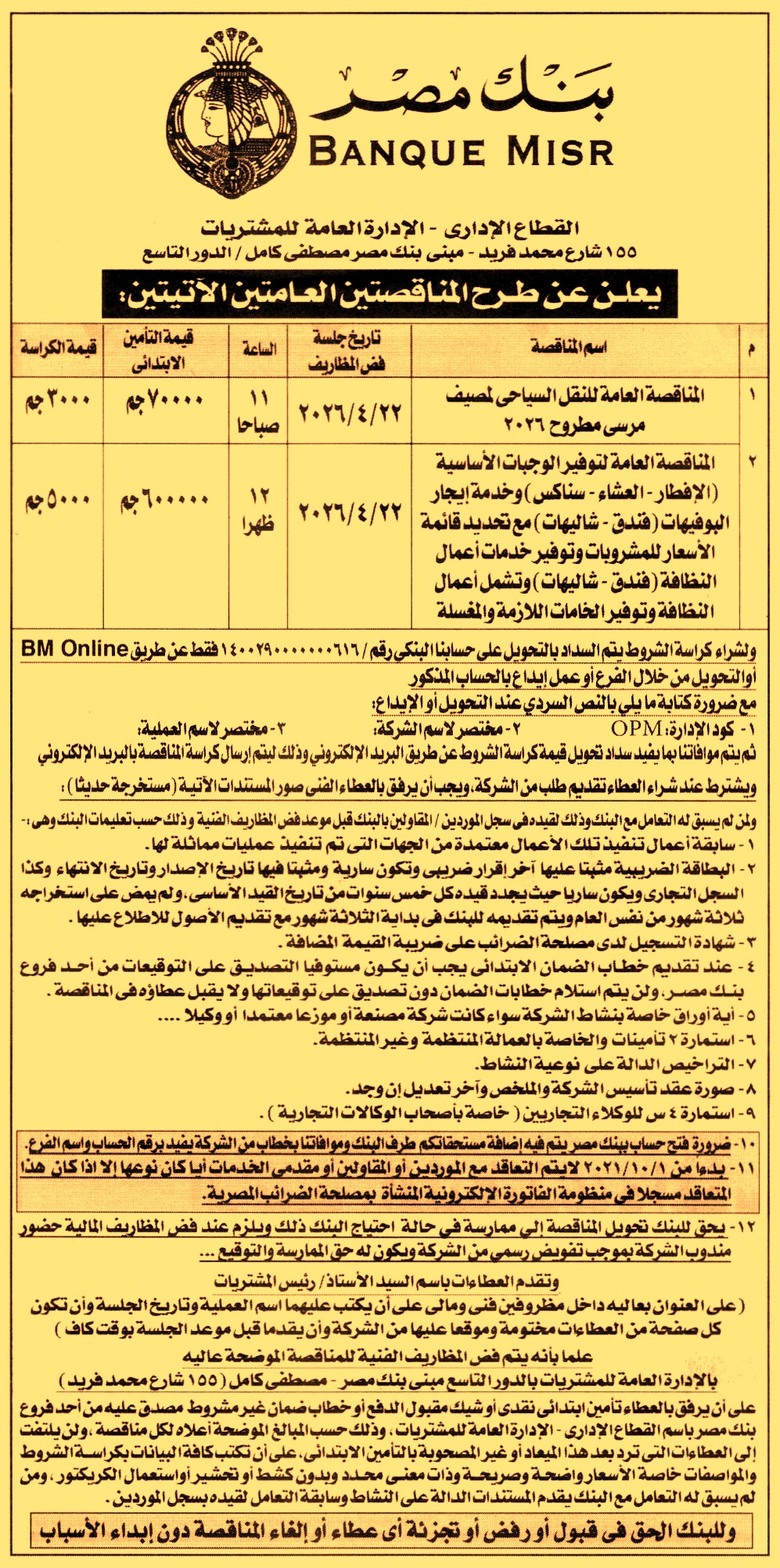 (يشترط عند شراء العطاء تقديم طلب من الشركة ويجب أن يرفق بالعطاء الفني صور المستندات المطلوبة “مستخرجة حديثا” لمن لم يسبق له التعامل مع البنك وذلك لقيده بسجل الموردين والمقاولين بالبنك وهي سابقة أعمال معتمدة وأخر إقرار ضريبي ويجب أن يكون السجل التجاري ساريا حيث يجدد قيده كل 5 سنوات من تاريخ القيد الأساسي ولم يمض على استخراجه 3 شهور من نفس العام ويتم تقديمة للبنك في بداية الـ3 شهور مع تقديم الأصول للاطلاع عليها وعند تقديم خطاب الضمان الابتدائي يجب أن يكون مستوفيا التصديق على التوقيعات من أحد فروع بنك مصر ولن يتم استلام خطابات الضمان دون تصديق على توقيعاتها ولا يقبل العطاء في المناقصة وأية أوراق خاصة بنشاط الشركة سواء كانت شركة مصنعة أو موزعا معتمدا أو وكيلا واستمارة 2 تأمينات والخاصة بالعمالة المنتظمة وغير المنتظمة والتراخيص الدالة علي نوعية النشاط وصورة عقد تأسيس الشركة والملخص وأخر تعديل إن وجد واستمارة 4 س للوكلاء التجاريين وضرورة فتح حساب ببنك مصر يتم فيه إضافة مستحقاتكم طرف البنك وموافاتنا بخطاب من الشركة يفيد برقم الحساب وأسم الفرع ويحق للبنك تحويل المناقصة إلى ممارسة في حالة احتياج البنك ذلك وللبنك الحق في قبول أو رفض أو تجزئة أي عطاء أو إلغاء المناقصة دون إبداء الأسباب