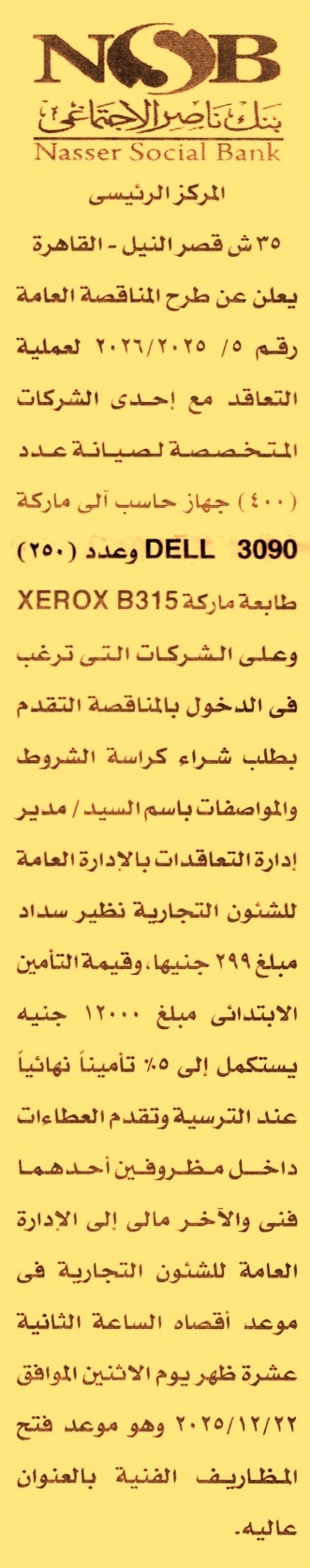 HOT Information مناقصة عامة رقم 5/2025/2026 لعملية صيانة عدد 400 جهاز حاسب ألي ماركة DELL 3090 وعدد 250 طابعة ماركة XEROX B315 عن جريدة الأخبار Post navigation الوحدة المحلية لمركز ومدينة قويسنا الجمعية التعاونية المشتركة للبناء والإسكان لمشروع لؤلؤة سوهاج الجديدة رقم 1
