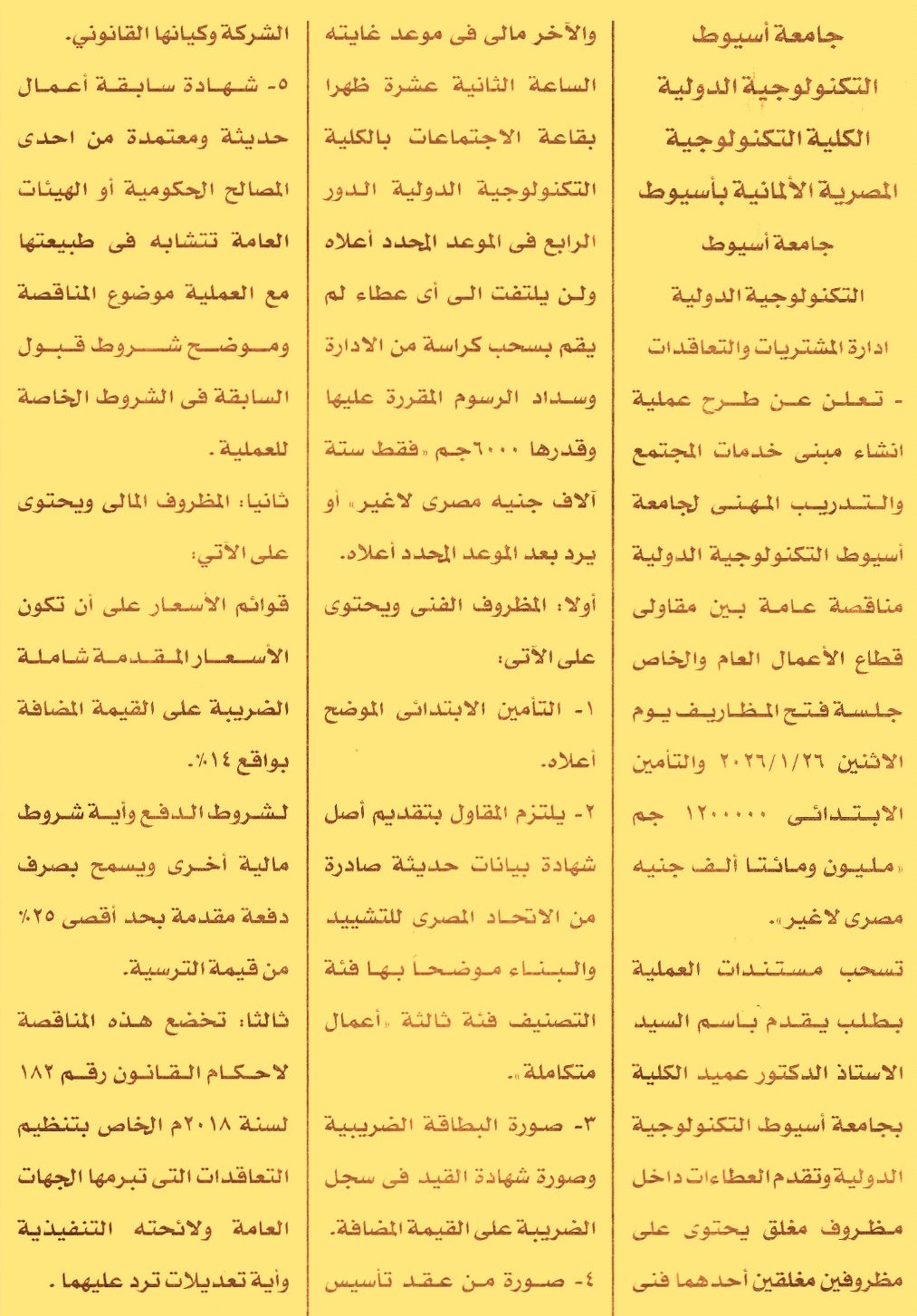 HOT Information مناقصة عامة لعملية انشاء مبنى خدمات المجتمع والتدريب المهني للجامعة (فئة التصنيف الثالثة شعبة أعمال مباني متكاملة ويرفق مع المستندات عقد تأسيس الشركة وسابقة أعمال ويسمح بصرف دفعة مقدمة بحد أقصى 25%) عن جريدة الأخبار Post navigation محافظة الشرقية نادي السنطة الرياضي
