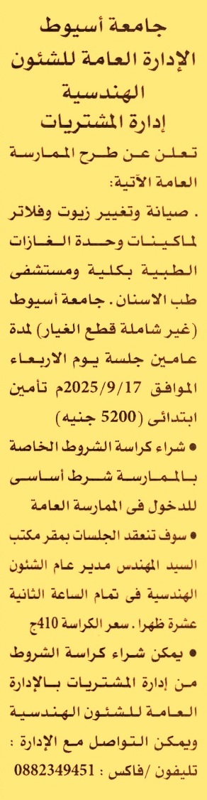 HOT Information ممارسة عامة لعملية صيانة وتغيير زيوت وفلاتر لماكينات وحدة الغازات الطبية بكلية ومسشتفى طب الأسنان بجامعة أسيوط غير شاملة قطع الغيار لمدة عامين عن جريدة الأهرام Post navigation نادي هليوبوليس الرياضي شركة الصرف الصحي بالإسكندرية