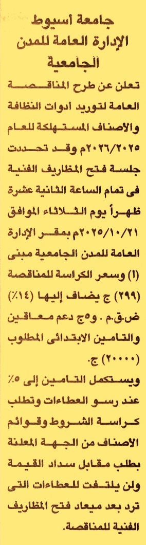 HOT Information مناقصة عامة لعملية توريد أدوات النظافة والأصناف المستهلكة للعام المالي 2025/2026 عن جريدة الجمهورية Post navigation مركز شباب دار السلام بدمياط محافظة أسيوط